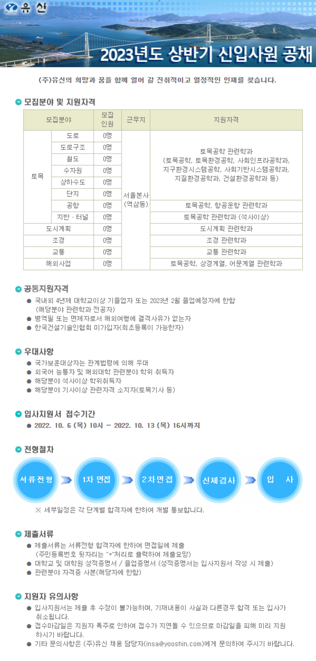 ※ MBA·해외 유수의 대학 학위 보유자, 외국어 능력자, 장교 출신 지운자 우대※근무지는 경인지역이며 회사 사정에 따라 변경될 수 있습니다.지원자격·모집분야별 전공자 및 경력보유자(기졸업자 또는 2023년 2월 졸업예정자)·군복무필 또는 면제자로 학업성적이 우수하여 해외여행 결격사유가 없는 자·TOEIC 750점 이상 취득자(2021년 1월 이후 응시한 국내시험에 한함) ※TOEIC 대체:TEPS 285점, TOEIC Speaking LV LIM3, OPIC LV LIM3 이상 근무형태 및 채용형태: 정규직(단 수습기간 3개월·공항접수방법) 전형절차